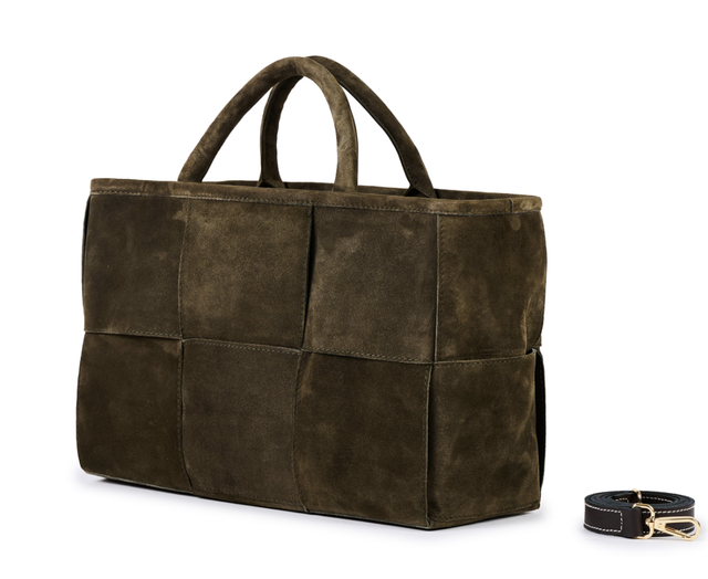 Borsa intrecciata in pelle scamosciata, borsa interna in pelle con zip, tasca interna e tracolla in pelle.