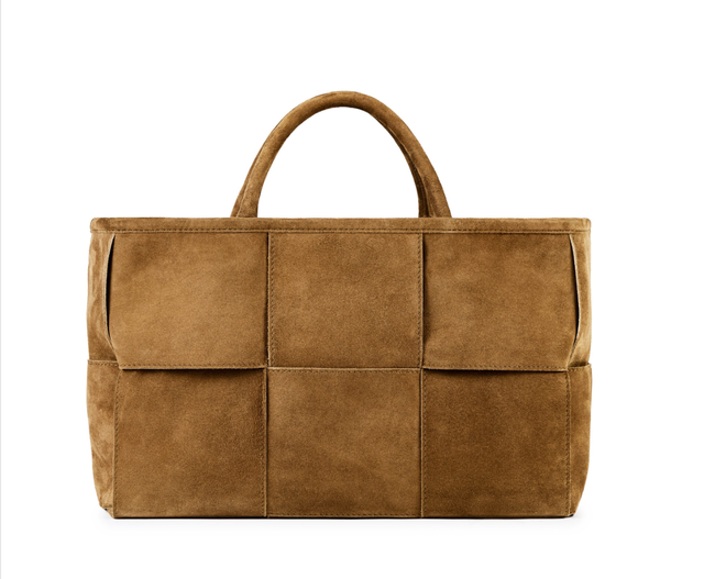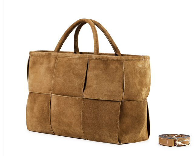 Borsa intrecciata in pelle scamosciata, borsa interna in pelle con zip, tasca interna e tracolla in pelle.