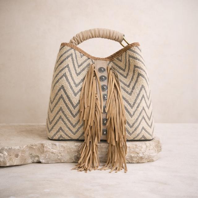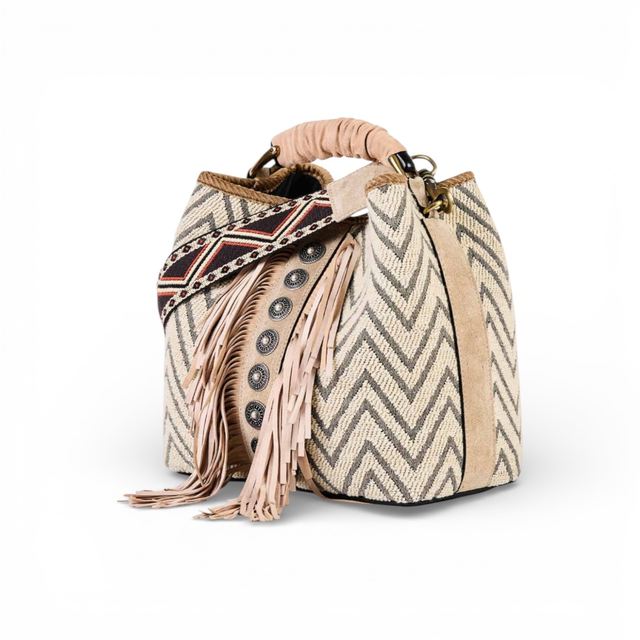 Secchiello jacquard con applicazione di frange in camoscio e borchie, manico in legno fasciato con camoscio, tasca interna e tracolla jacquard.