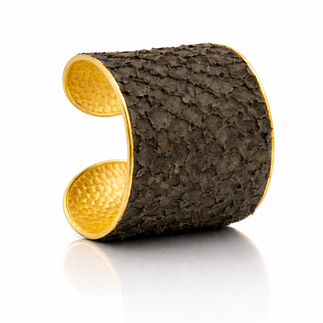 Bracciale in ottone placco oro 24kt, lastra martellata e profilata a mano, rivestita in pelle di persico.