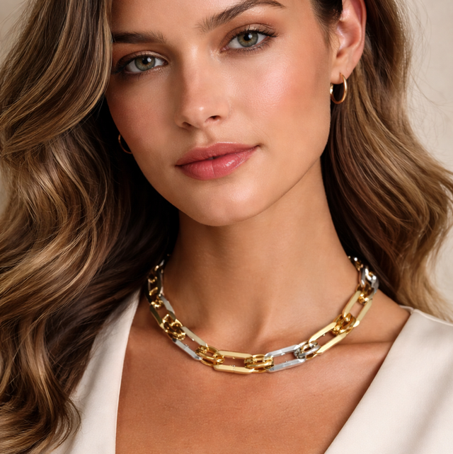 Oval cable chain necklace combined with big rectangle links interlaced with two oval rings.