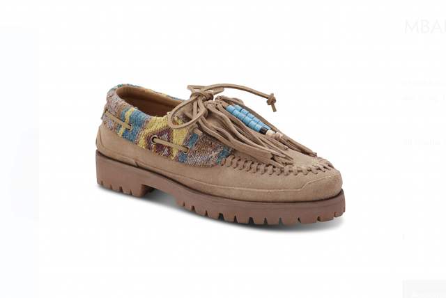 Topsider with a arena-colored calfskin upper and multicolored etnic fabric details and calfskin lining. Leather laces threaded into the upper, rubber sole.